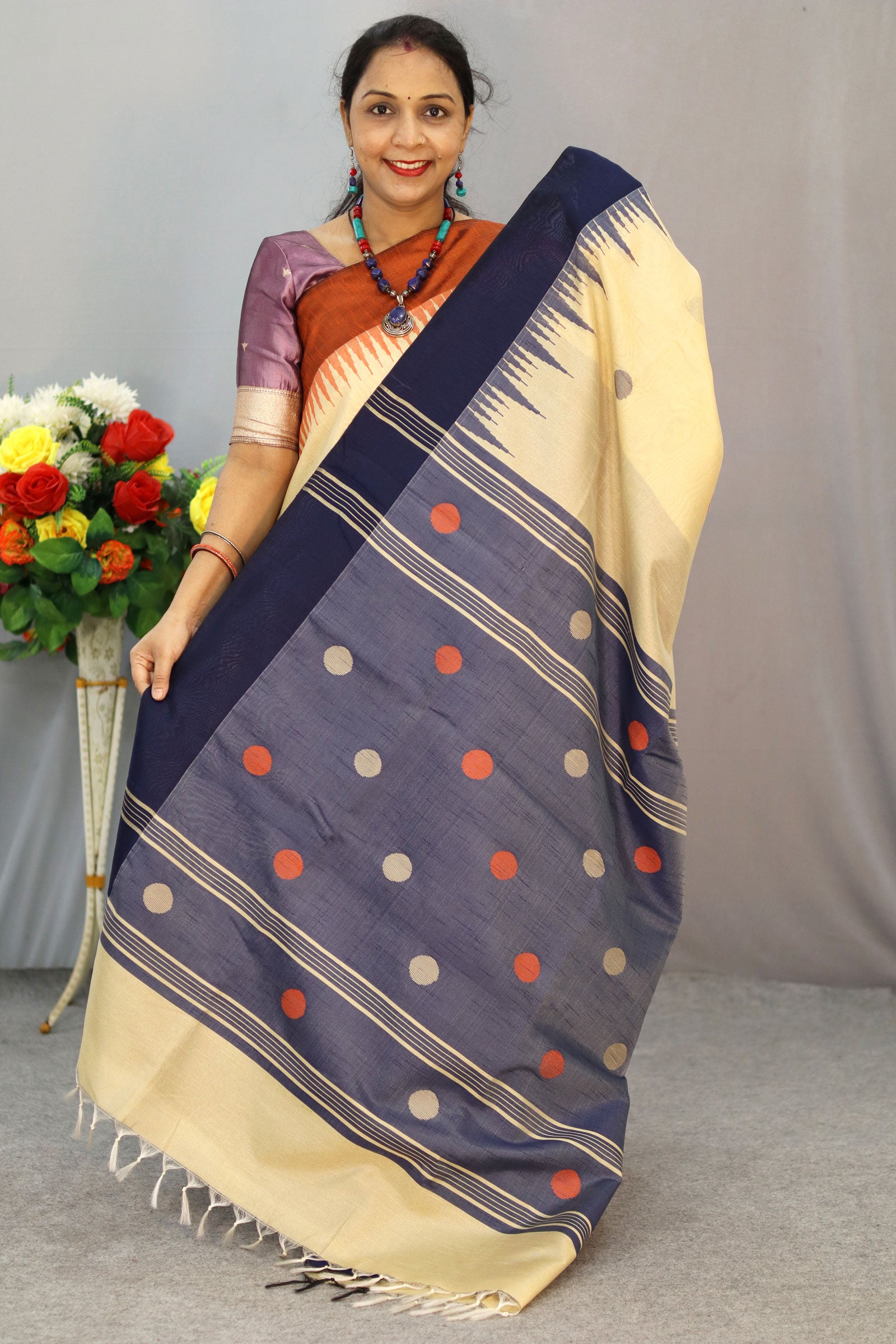 "Elegant navy blue hand-woven saree, crafted with intricate artistry."