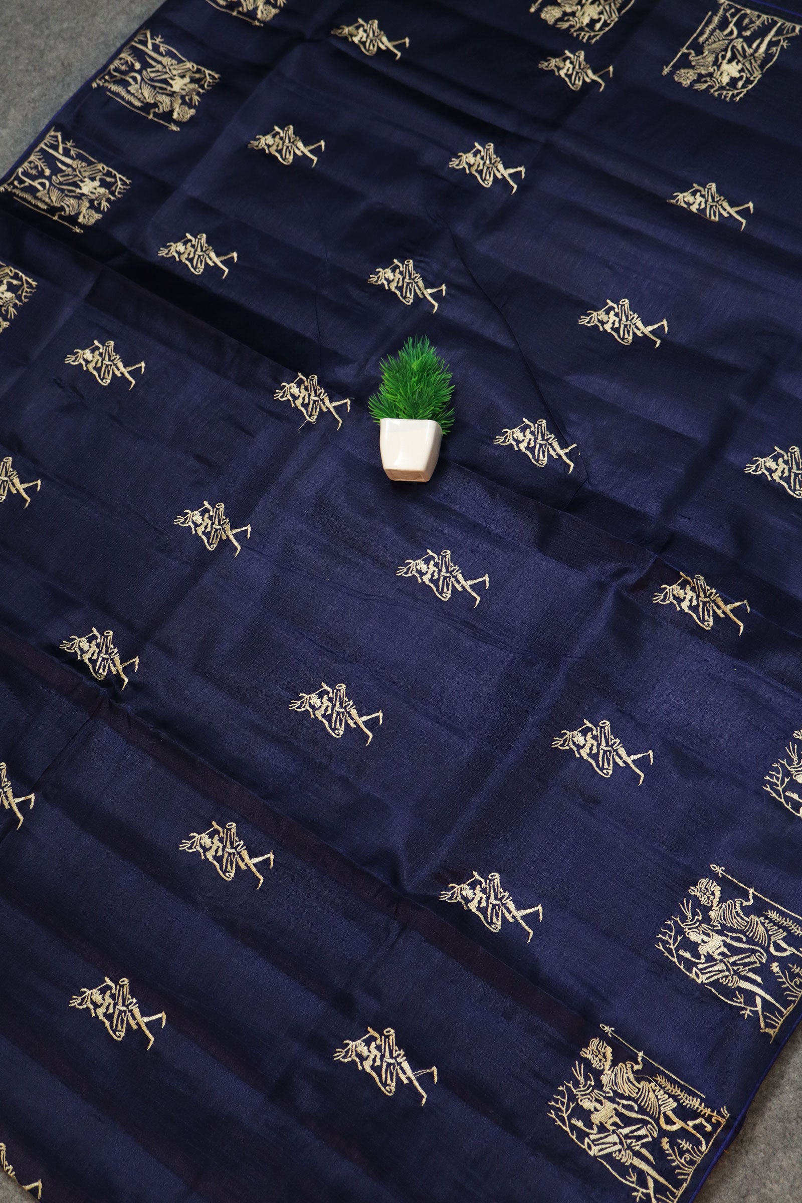 Deep Navy Blue Tussar Silk Saree Showcasing Heritage Handloom Weaving And Embroidery