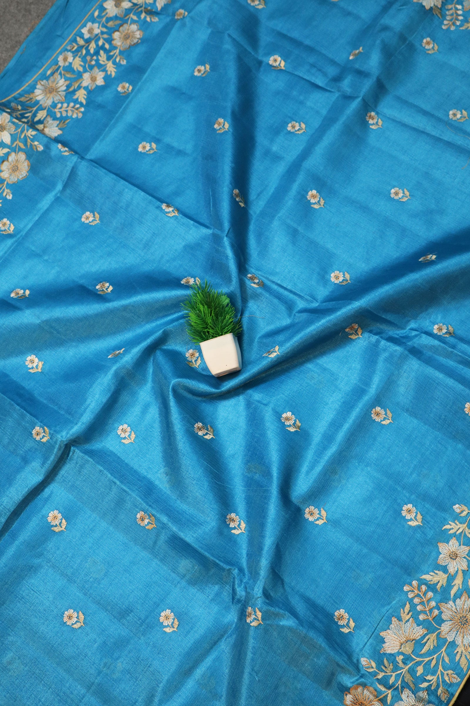 Handloom Turquoise Tussar Silk Embroidered Lightweight Premium Saree